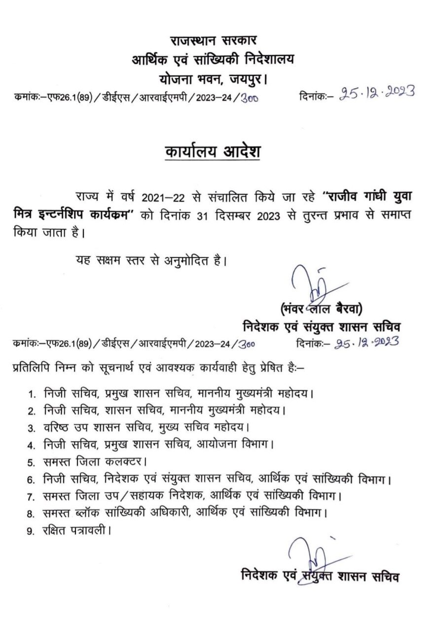 राजस्थान की नई बीजेपी सरकार ने राजीव गांधी युवा मित्र इंटर्नशिप योजना को रद्द कर दिया है. इस योजना को 2021 में राज्य की तत्कालीन कांग्रेस की अशोक गहलोत सरकार ने शुरू किया था, जिसके तहत