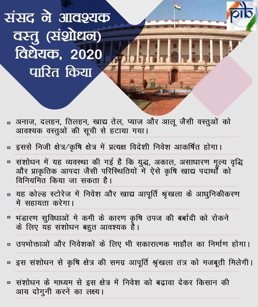 इस बिल के पास होने के बाद अब दाल. अनाज, तिलहन, खाद्य तेलों, प्याज एवं आलू को आवश्यक वस्तुओं की सूची से बाहर कर दिया गया है. यानी ऐसे सामानों को स्टोरेज करने में कोई दिक्कत नहीं होगी, साथ ही युद्ध या किसी अन्य आपातकाल की स्थिति में सरकार स्टोरेज को लेकर आदेश दे सकती है. ये बिल कृषि बिल से ही जुड़ा है.