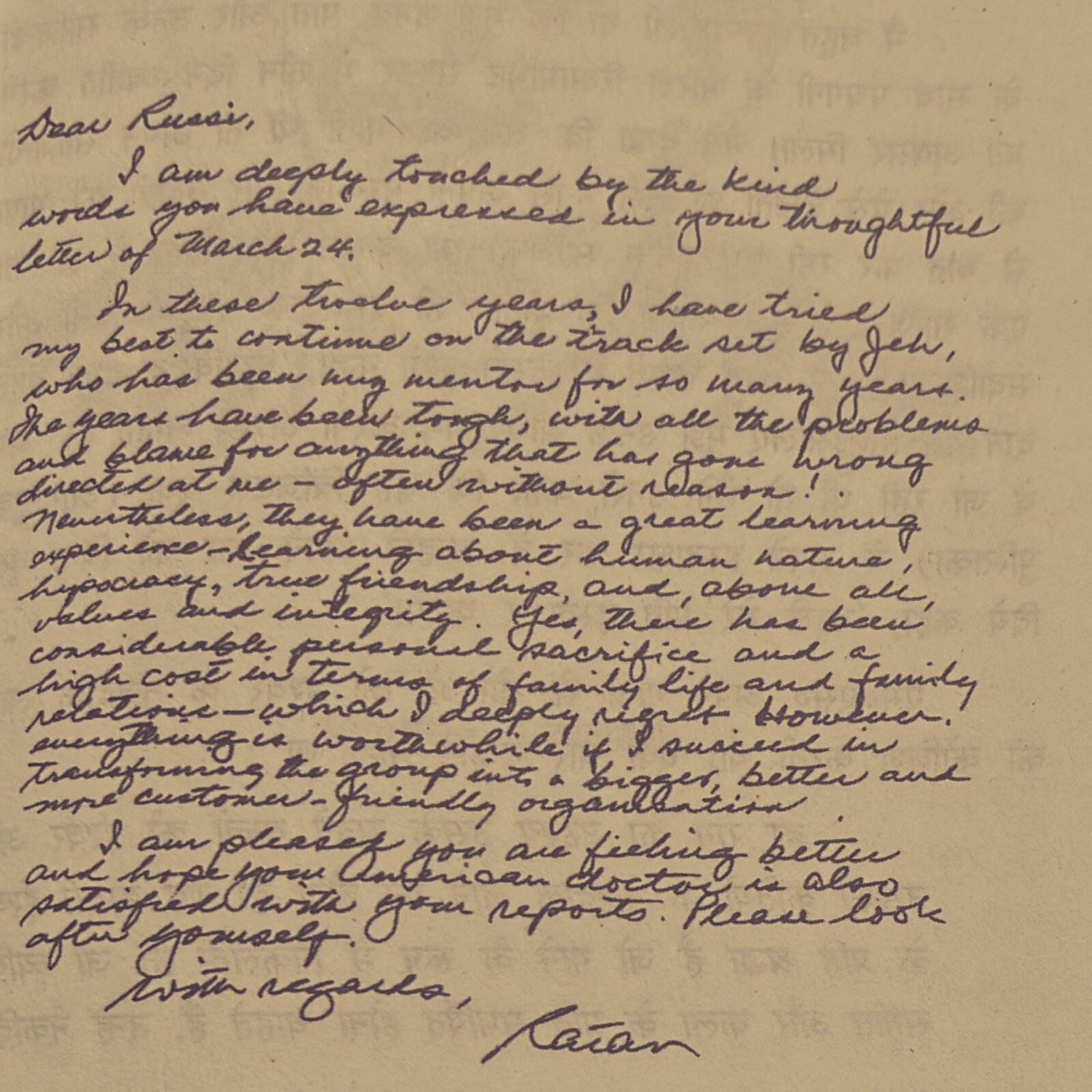 रतन ने इस चिट्ठी में लिखा है कि इन सालों में मैंने पूरे कोशिश की है कि मैं अपने मार्गदर्शक जेआरडी टाटा के दिखाए गए रास्तों पर चल सकूं. यह साल काफी कठिन रहा, कई समस्याएं आईं. अगर कोई गड़बड़ हो जाती तो सारी जिम्मेदारी मुझ पर आ जाती. मैंने मानव स्वभाव, हिप्पोक्रेसी, सच्ची दोस्ती और सबसे बढ़कर मूल्यों और अखंडता के बारे में बहुत कुछ सीखा है. कई जगह मुझे बलिदान भी देना पड़ा और अपने पारिवारिक जीवन और संबंधियों से दूर होना पड़ा, जिसका मुझे बेहद अफसोस है. लेकिन मैं सोचता हूं कि अगर मुझे इस समुदाय को एक अच्छा और उपभोक्ता हितैषी संगठन बनाने में सफलता मिले तो मुझे इस बलिदान का मूल्य मिल जाएगा.