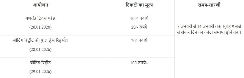 पीआईबी पर मौजूद जानकारी के मुताबिक, 26 जनवरी को गणतंत्र दिवस परेड, 28 जनवरी को बीटिंग रिट्रीट की फुल ड्रेस रिहर्सल और 29 जनवरी को बीटिंग रिट्रीट के मुख्य समारोह के टिकट आधिकारिक वेबसाइट aamantran.mod.gov.in से सीधे खरीद सकते हैं.