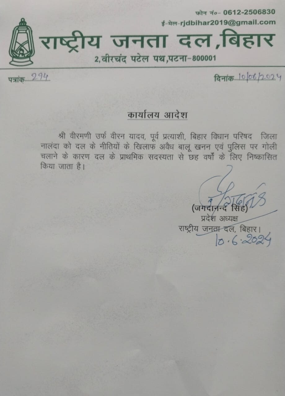 राष्ट्रीय जनता दल के प्रदेश अध्यक्ष जगदानंद सिंह ने कार्रवाई की है. पार्टी की तरफ से जारी एक नोटिफिकेशन में कहा गया है, "वीरमणी उर्फ वीरन यादव, पूर्व प्रत्याशी, बिहार विधान परिषद, जिला नालंदा को दल के नीतियों के खिलाफ अवैध बालू खनन और पुलिस पर गोली चालने के कारण दल के प्राथमिक सदस्यता से छह वर्षों के लिए निष्कासित किया जाता है."