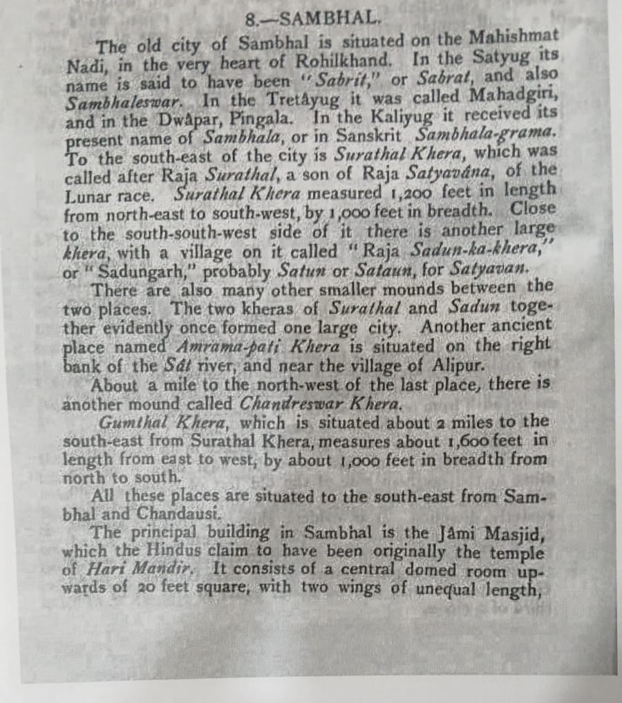 कार्लाइल की किताब संभल शहर की भी चर्चा करती है, जिसमें कहा गया है, "संभल का पुराना शहर महिषमत नदी पर स्थित है, जो रोहिलखंड के दिल में है. सत्ययुग में इसका नाम सबिरी या सब्रत था और इसे संभलवेश्वर के नाम से भी जाना जाता था. त्रेतायुग में इसे महादगिरी कहा गया और द्वापर में पिंगला. कलियुग में इसे संभल या संस्कृत में संभलग्राम कहा गया."
