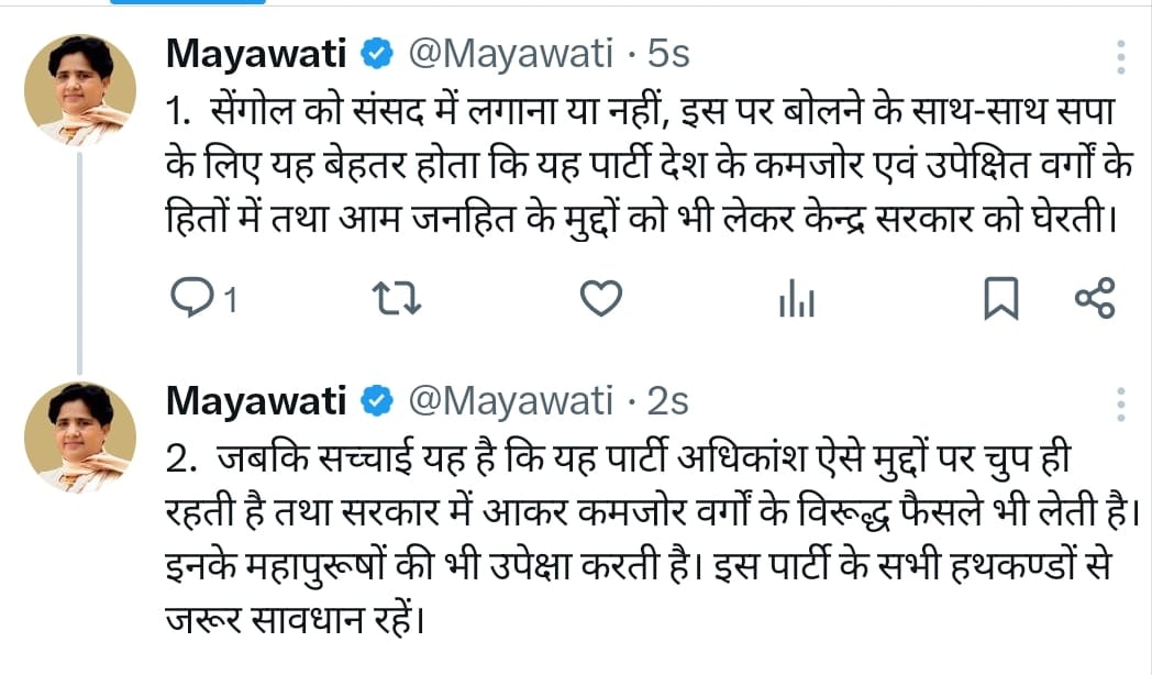 बहुजन समाज पार्टी (बसपा) प्रमुख मायावती ने कहा कि सेंगोल को संसद में लगाना या नहीं, इस पर बोलने के साथ-साथ सपा के लिए यह बेहतर होता कि यह पार्टी देश के कमजोर एवं उपेक्षित वर्गों के हितों में और आम जनहित के मुद्दों को भी केंद्र सरकार को घेरती है.