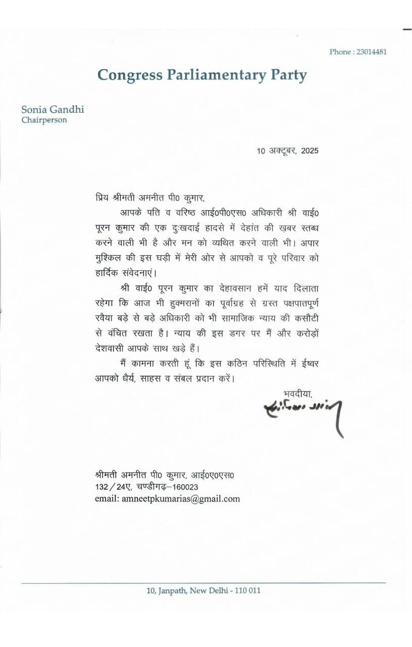 हरियाणा के आईपीएस अधिकारी वाई पूरन कुमार की आत्महत्या के मामले ने राजनीतिक और प्रशासनिक हलकों में गहरी हलचल मचा दी है. कांग्रेस की वरिष्ठ नेता सोनिया गांधी ने मृतक अधिकारी की पत्नी को चिट्ठी लिखकर गहरी संवेदना जताई और कहा कि पूरन कुमार की मौत यह याद दिलाती है कि "हमारे समाज में अब भी ऐसे पूर्वाग्रह मौजूद हैं, जो वरिष्ठ दलित अधिकारियों को भी सामाजिक समानता से वंचित रखते हैं."
