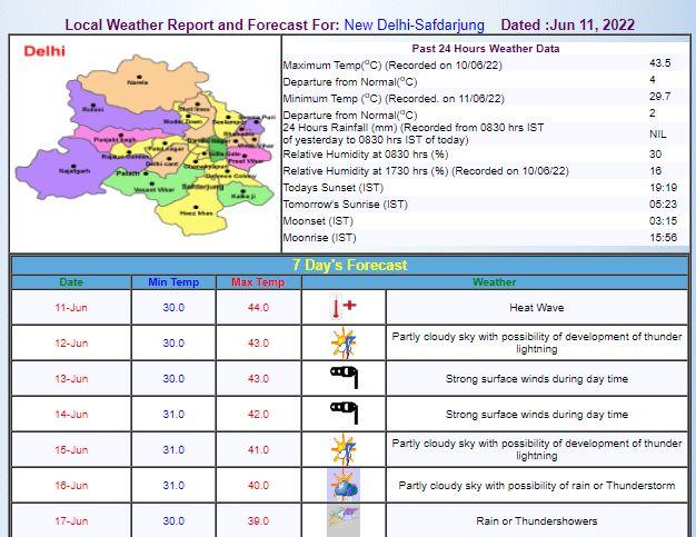 राष्ट्रीय राजधानी में शनिवार, 11 जून को न्यूनतम तापमान 29.7 डिग्री सेल्सियस दर्ज किया गया जो कि सामान्य से दो डिग्री ज्यादा है. इसके साथ ही भारत मौसम विज्ञान विभाग ने आंशिक रूप से बादल छाए रहने तथा आंधी का पूर्वानुमान जताया है. विभाग ने के मुताबिक, दिल्ली में अधिकतम तापमान 43 डिग्री सेल्सियस रहने की उम्मीद है. वहीं, दिल्ली-एनसीआर में नमी युक्त पूर्वा हवाएं 16 जून से भीषण गर्मी से राहत दिला सकती हैं. राष्ट्रीय राजधानी में 16 जून को गरज और बारिश की संभावना है.
