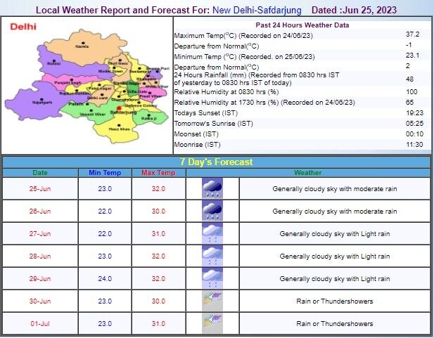 IMD के मुताबिक, यमुनानगर, करनाल, पानीपत, आदमपुर, हिसार, गोहाना, गन्नौर,सिवानी, सोनीपत, रोहतक, भिवानी और आस-पास के इलाकों में अगले कुछ घंटों में हल्की से मध्यम तीव्रता की बारिश होगी. वहीं, दादरी, झज्जर, महेंद्रगढ़, सोहाना, रेवाड़ी, पलवल, बावल, नूंह, औरंगाबाद, होडल, सहारनपुर, देवबंद, नजीबाबाद, शामली, मुजफ्फरनगर, कांधला, बिजनौर, चांदपुर, बड़ौत, दौराला, खतौली, हस्तिनापुर, बागपत, मेरठ, मोदीनगर, किठौर, मुरादाबाद, गढ़मुक्तेश्वर, रामपुर, पिलखुआ, हापुड़, सिकंदराबाद, बुलंदशहर, जहांगीराबाद, शिकारपुर, खुर्जा, जट्टारी, अतरौली, अलवर समेत कई शहरों में आज (रविवार), 25 जून को बारिश होगी.
