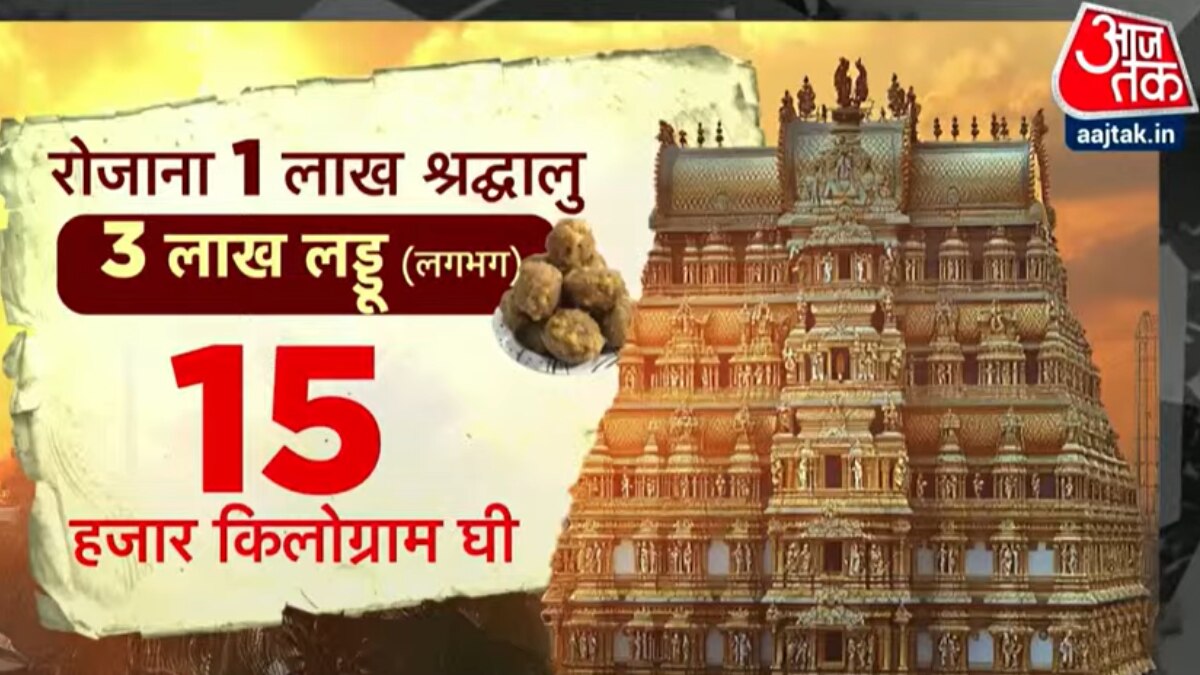 इस मंदिर में हर रोज़ आने वाले एक लाख हिन्दू श्रद्धालुओं के लिए लगभग 3 लाख लड्डू बनाए जाते हैं, जिनके लिए 15 टन यानी 15 हज़ार किलोग्राम घी का इस्तेमाल होता है. अगर हम पूरे साल की बात करें तो पूरे साल में मन्दिर समिति इन लड्डुओं को बनाने के लिए 54 लाख किलोग्राम घी का इस्तेमाल करती है और ये घी अलग-अलग कम्पनियों और गोशालाओं से आता है. मंदिर समिति के पूर्व सदस्यों का कहना है कि उन्होंने गुजरात और राजस्थान से विशेष नस्ल की साढ़े 500 गाय खरीदी हैं, जिन्हें तिरुपति मन्दिर की गोशालाओं में रखा जाता है और इन गायों के घी से मन्दिर के लड्डू बनाए जाते हैं, लेकिन लड्डुओं की मांग बहुत ज्यादा होती है और प्रतिदिन इन्हें बनाने के लिए 15 हजार किलोग्राम घी की आवश्यकता होती है. इसलिए ये घी बाहर की कुछ कंपनियों से भी खरीदा जाता है. प्रसाद के लड्डुओं में मिलावट की कहानी भी यहीं से शुरू होती है.