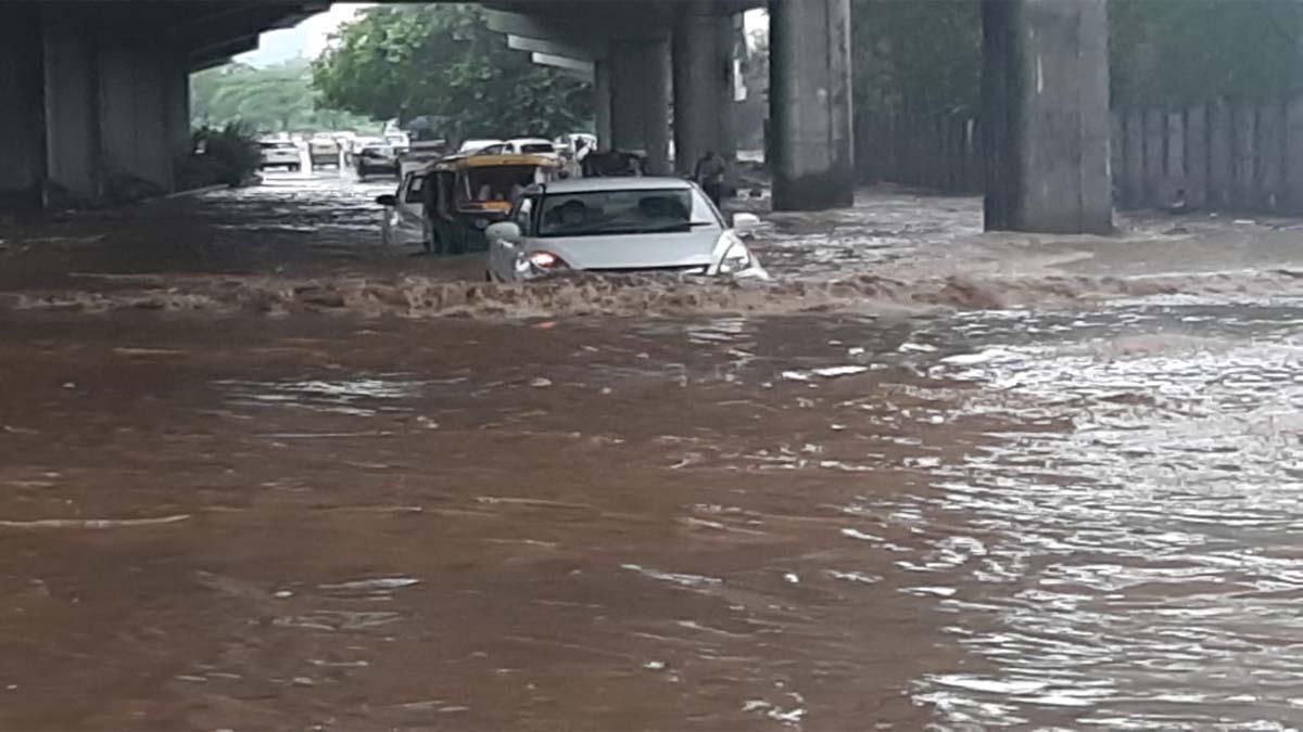 #WATCH | Haryana: Parts of Gurugram face waterlogging after receiving rainfall this morning.