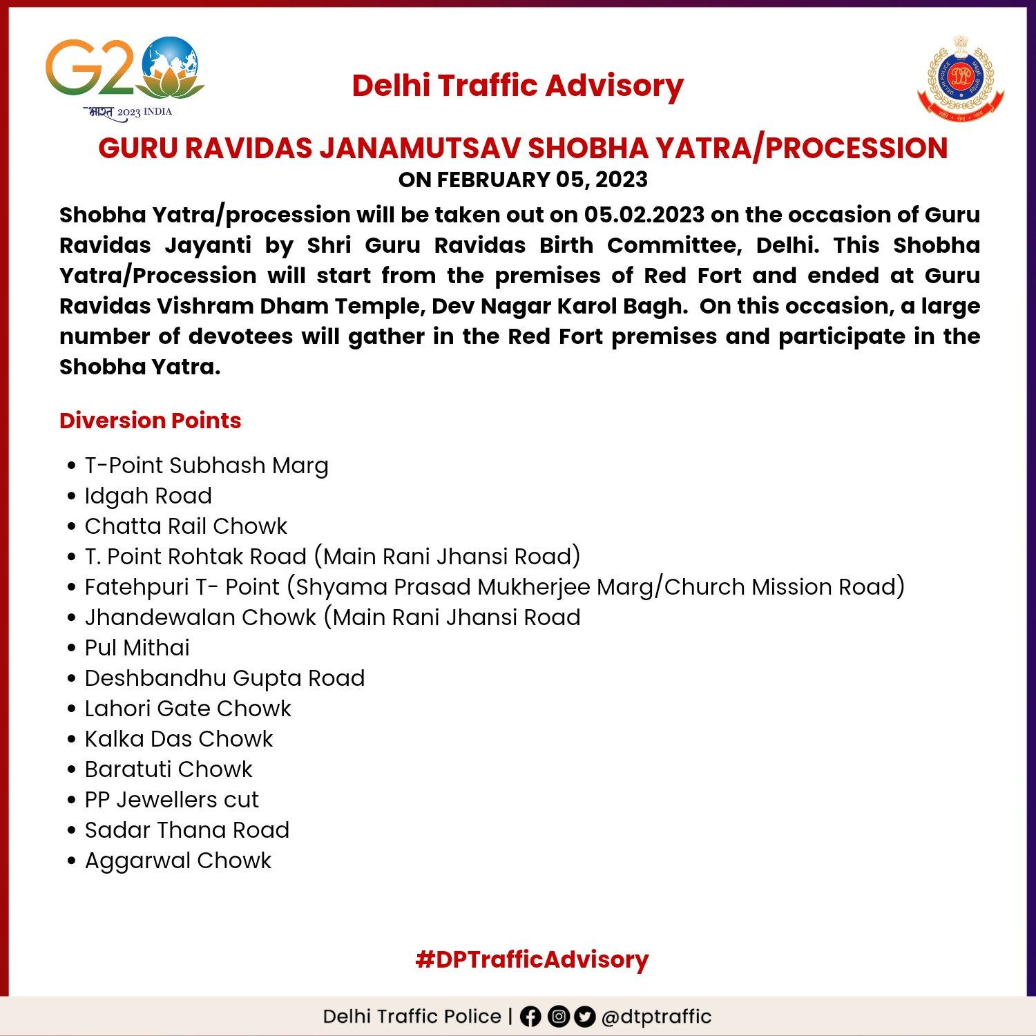 Delhi Police Traffic Advisory Today Guru Ravidas Jayanti: गुरु रविदास जयंती के मौके पर दिल्ली ट्रैफिक पुलिस ने एडवाइजरी जारी की है. दिल्ली ट्रैफिक पुलिस ने ट्वीट कर जानकारी दी कि संत रविदास जयंती के अवसर पर 5 फरवरी 2023 को दोपहर 2 बजे से शाम 5 बजे तक शोभा यात्रा निकाली जाएगी. लाल किले से करोल बाग तक शोभा यात्रा निकलने की वजह से इस रूट पर ओर जाने वाले लोगों को दिक्कत का सामना करना पड़ सकता है. ऐसे में किसी भी असुविधा से बचने के लिए घर से निकलने से पहले ही एक बार रूट चेक कर लें.