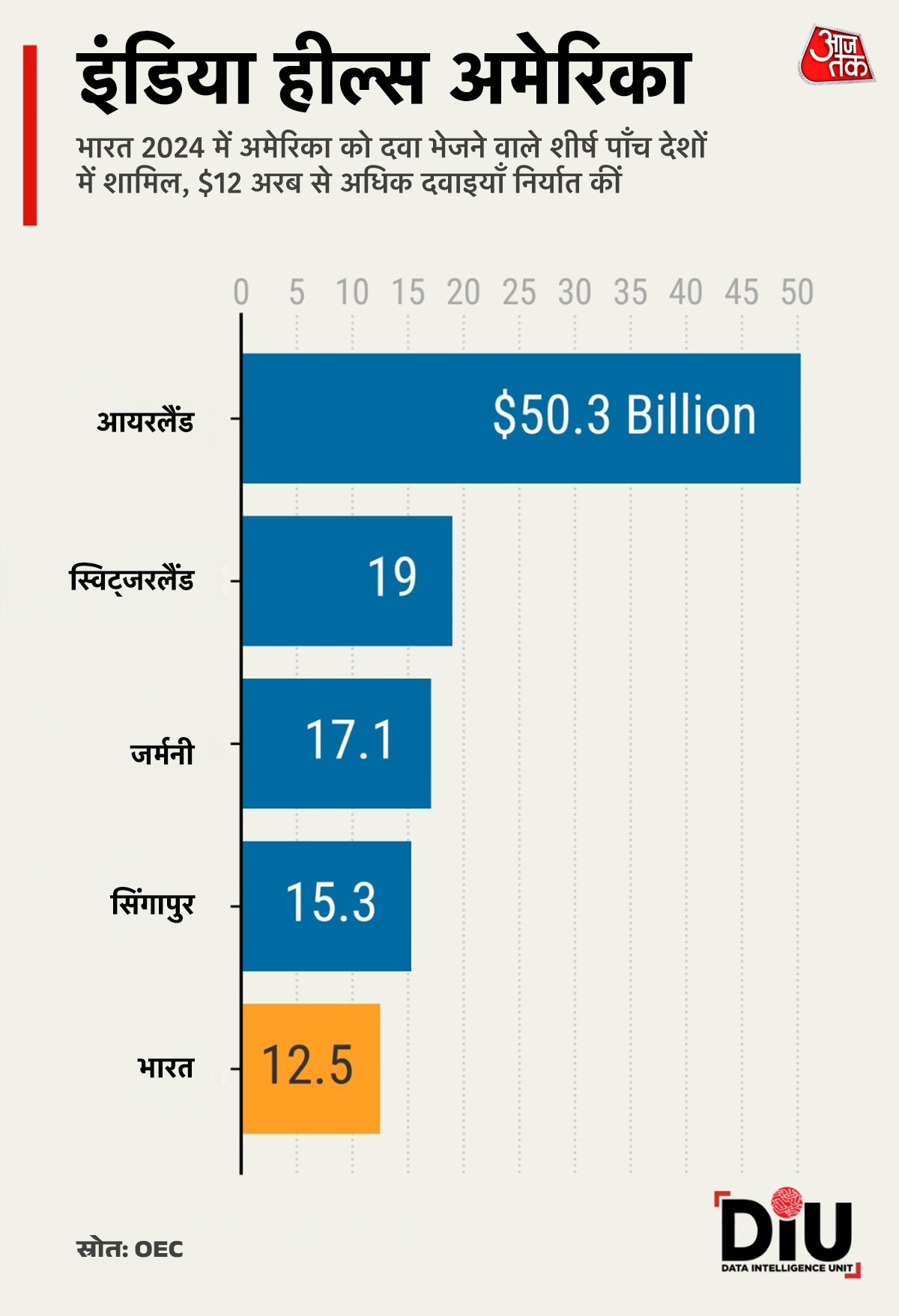 भारत अमेरिका को दवाएं सप्लाई करने वाले टॉप-5 देशों में शामिल है. ट्रंप ने आयातित दवाओं पर 250% तक टैरिफ लगाने की योजना बनाई है जो अमेरिका के अस्पतालों और मरीजों के लिए मुश्किलें खड़ी कर सकती है. ट्रंप ने आयरलैंड के प्रधानमंत्री को भी 200% टैरिफ की बात कही है जो अमेरिका को सबसे ज्यादा दवाएं भेजता है. भारत 12.5 अरब डॉलर की सस्ती जेनेरिक दवाएं अमेरिका को भेजता है जो वहां की हेल्थकेयर सिस्टम की रीढ़ है.