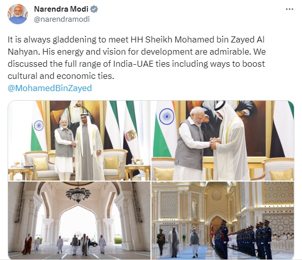 इससे पहले पीएम ने एक और ट्वीट में तस्वीरें साझा कीं, जिसमें संयुक्त अरब अमीरात के राष्ट्रपति पीएम मोदी को फ्रैंडशिप बैंड पहनाते नजर आ रहे हैं. अपने ट्वीट में पीएम ने लिखा, "शेख मोहम्मद बिन जायद अल नाहयान से मिलकर हमेशा खुशी होती है. उनकी ऊर्जा और विकास की दृष्टि सराहनीय है. हमने सांस्कृतिक और आर्थिक संबंधों को बढ़ावा देने के तरीकों सहित भारत-यूएई संबंधों पर चर्चा की."