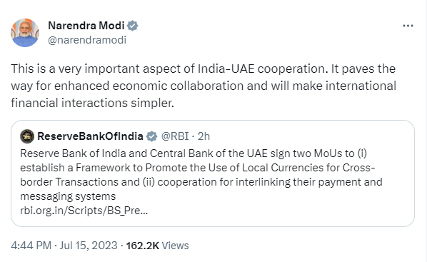 दोनों देशों के केंद्रीय बैंकों के बीच समझौता ज्ञापनों के बारे में बात करते हुए, पीएम ने कहा, "यह भारत-यूएई सहयोग का एक बहुत ही महत्वपूर्ण पहलू है. यह आर्थिक सहयोग बढ़ाने का मार्ग प्रशस्त करता है और अंतरराष्ट्रीय वित्तीय बातचीत को सरल बनाएगा. यूएई में आयोजित होने वाले सीओपी-28 की तैयारी यूएई के राष्ट्रपति के नेतृत्व में चल रही है, और वह इस साल के अंत में सम्मेलन में भाग लेने वाले हैं.