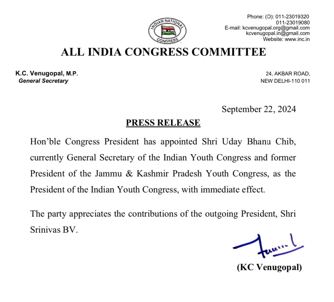 कांग्रेस अध्यक्ष मल्लिकार्जुन खड़गे ने एक बयान में कहा कि उदय भानु चिब को तत्काल प्रभाव से भारतीय युवा कांग्रेस का अध्यक्ष नियुक्त किया गया है. शुक्रवार को चिब ने लोकसभा में विपक्ष के नेता राहुल गांधी के साथ एक तस्वीर पोस्ट की थी और लिखा था कि मेरे नेता राहुल गांधी के साथ एक यादगार मुलाकात. सामाजिक न्याय के लिए आपका संघर्ष और दृढ़ता हम सभी के लिए प्रेरणा है. उदयभानु चिब जम्मू के पलौरा से हैं और कांग्रेस नेता हरि सिंह चिब के पुत्र हैं.