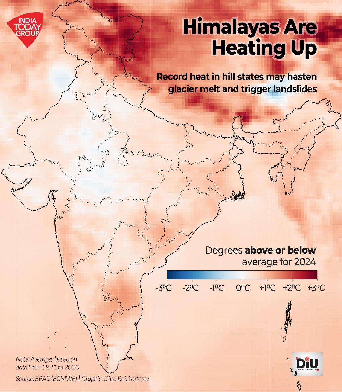 यहां तापमान असामान्यता का नक्शा डालें जिसमें हिमालय और तिब्बती पठार के कुछ हिस्सों, विशेष रूप से हिमाचल और उत्तराखंड के आसपास के क्षेत्रों में जून के दौरान तापमान बदलाव दिखाए जाएं.