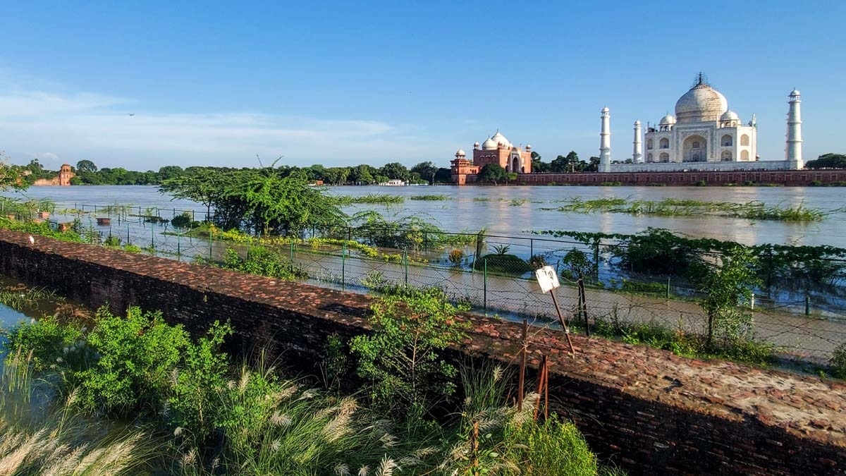 ताज नगरी आगरा में यमुना नदी का जलस्तर इतना बढ़ गया कि ताजमहल की दीवारों तक पानी पहुंच गया है. ये पहला मौका है जब 45 साल बाद यमुना ने ताजमहल की दीवारों को छू लिया. हालात ये हैं कि स्मारत के पीछे के बगीचे जलमग्न हो गए हैं. हर तरफ पानी ही पानी दिखाई दे रहा है.