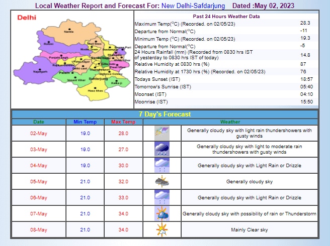 दिल्ली की बात करें तो यहां भी अगले 5 दिन तक सूरज के सितम से राहत बरकरार रहेगी. आज यानी 3 मई को दिल्ली में आमतौर पर बादल छाए रहने के साथ हल्की से मध्यम बारिश और गरज के साथ तेज हवाएं चलेंगी. तापमान की बात करें तो न्यूनतम तापमान 19 डिग्री सेल्सियस और अधिकतम तापमान 27 डिग्री सेल्सियस रह सकता है. दिल्ली में वीकेंड पर भी बारिश होने की संभावना है.