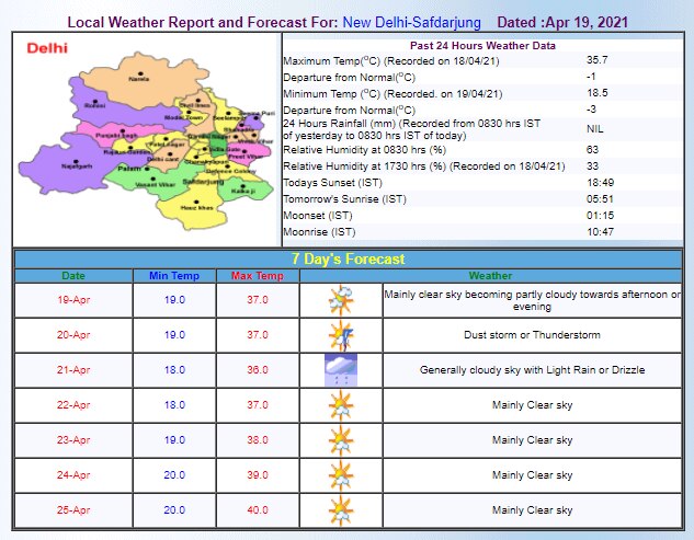 दिल्ली: न्यूनतम 18 डिग्री सेल्सियस और अधिकतम 36 डिग्री सेल्सियस रहने की संभावना है.