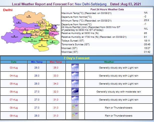 मौसम विभाग के अनुसार दिल्ली में 03 अगस्त को न्यूनतम तापमान (Minimum Temperature) 26 डिग्री सेल्सियस जबकि अधिकतम तापमान (Maximum Temperature) 33 डिग्री सेल्सियस रहने की उम्मीद है. वहीं, पूर्वानुमान के मुताबिक 07 अगस्त तक बारिश का रुक-रुक कर बारिश का सिलसिला जारी रहेगा.