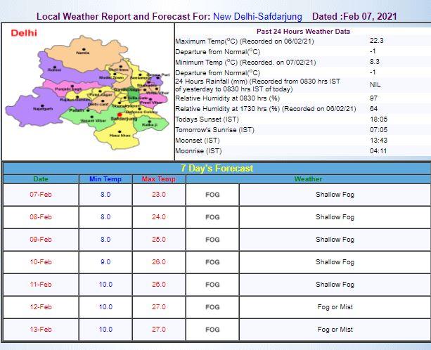 दिल्ली का न्यूनतम तापमान बढ़कर अब 8 डिग्री सेल्सियस तक पहुंच गया है. भारत मौसम विज्ञान विभाग के पूर्वानुमान के अनुसार अगले तीन-चार दिनों तक अधिकतम तापमान 23-25 डिग्री सेल्सियस तक रह सकता है.