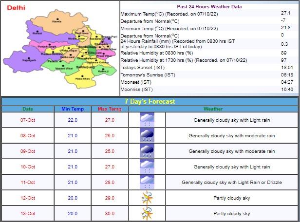 आईएमडी के मुताबिक, 08 से 11 अक्टूबर के दौरान अरुणाचल प्रदेश और असम, मेघालय में भारी बारिश हो सकती है. इसके अलावा 10 -11 अक्टूबर को नागालैंड, मणिपुर, मिजोरम और त्रिपुरा में अलग-अलग जगहों पर भारी बारिश की आशंका है. वहीं, देश की राजधानी दिल्ली में भी बारिश से मौसम सुहावना हो गया है. मौसम विभाग के पूर्वानुमान के मुताबिक, दिल्ली में अगले 3-4 दिन हल्की से मध्यम बारिश जारी रहेगी.