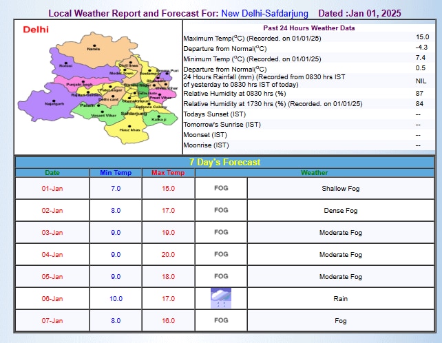 राजधानी दिल्ली की बात करें तो 1 जनवरी, 2025 को दिल्ली में लगातार तीसरे दिन भी कोल्ड डे रहा और पूरे क्षेत्र में अधिकतम तापमान में उल्लेखनीय गिरावट दर्ज की गई. शाम 5.30 बजे दर्ज किए गए आंकड़ों के अनुसार, सफदरजंग में अधिकतम तापमान 15.0 डिग्री सेल्सियस दर्ज किया गया, जो पिछले दिन से 2.7 डिग्री सेल्सियस की गिरावट और सामान्य से -4.3 डिग्री सेल्सियस की उल्लेखनीय गिरावट को दर्शाता है. इस बीच, पालम में अधिकतम तापमान और भी कम 12.8 डिग्री सेल्सियस दर्ज किया गया, जो 24 घंटों में 2.1 डिग्री सेल्सियस की गिरावट और सामान्य मूल्यों से -5.9 डिग्री सेल्सियस की गिरावट को दर्शाता है.