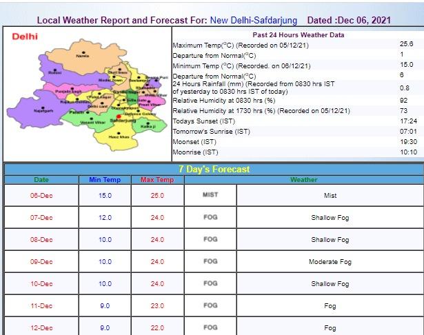 मौसम विभाग (IMD) का मानना है कि अगले 24 घंटे में दिल्ली-एनसीआर में बादलों की आवाजाही रहेगी. वहीं, राष्ट्रीय राजधानी दिल्ली में इस हफ्ते से तापमान में लगातार कमी दर्ज की जाएगी. मौसम पूर्वानुमान के मुताबिक, दिल्ली में आज (सोमवार) यानी 06 दिसंबर को अधिकतम तापमान 25 डिग्री सेल्सियस जबकि न्यूनतम तापमान 12 डिग्री सेल्सियस रहने का अनुमान है.