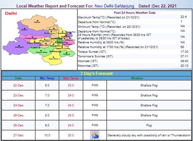 मौसम विभाग (IMD) के पूर्वानुमान के अनुसार, गुरुवार से ठंड से राहत मिलनी शुरू हो जाएगी. 27 दिसंबर तक ठंड का प्रकोप थोड़ा कम होने के आसार हैं. हालांकि, इस दौरान कोहरा छाया रह सकता है. पूर्वानुमान के अनुसार, इस बीच न्यूनतम तापमान 5 से 7 डिग्री सेल्सियस और अधिकतम तापमान 21 से 24 डिग्री सेल्सियस के रहने के आसार हैं.
