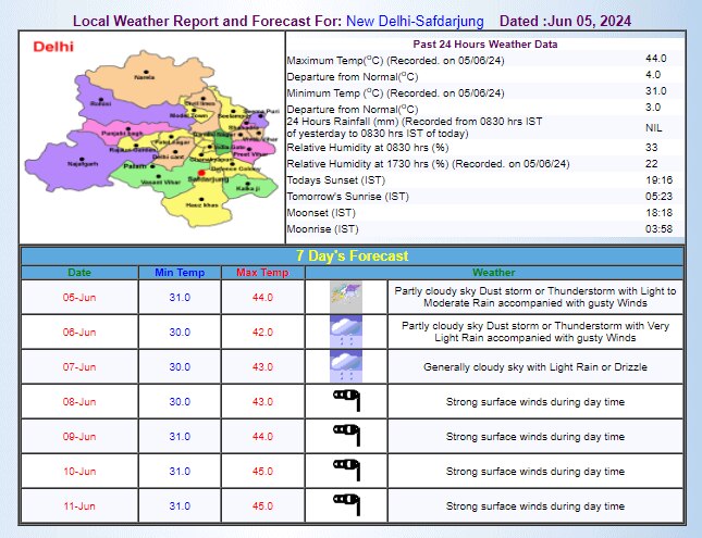 राजधानी दिल्ली के मौसम की बात करें तो यहां आज भी आंशिक रूप से बादल छाए रहेंगे और धूल भरी आंधी या गरज के साथ तेज हवाओं के साथ बहुत हल्की बारिश हो सकती है. तापमान की बात करें तो आज यहां का न्यूनतम तापमान 30 डिग्री सेल्सियस और अधिकतम तापमान 42 डिग्री सेल्सियस दर्ज किया गया जा सकता है. जो कल के मुकाबले 2 डिग्री कम रहेगा.