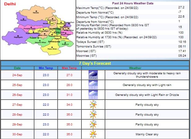 मौसम विभाग के पूर्वानुमान के मुताबिक, दिल्ली में आज यानी 25 सितंबर को न्यूनतम तापमान 23 डिग्री और अधिकतम तापमान 28 डिग्री सेल्सियस रहेगा. वहीं, दिल्ली में आज (रविवार) को दिन भर बादल छाए रहने के बीच कुछ स्थानों पर हल्की तो कुछ जगहों पर मध्यम से भारी बारिश होने का पूर्वानुमान है. दिल्ली ट्रैफिक पुलिस ने ट्वीट करके उन इलाकों की जानकारी दी है जहां बारिश के चलते जलजमाव या गड्ढों के कारण यातायात प्रभावित होता है.