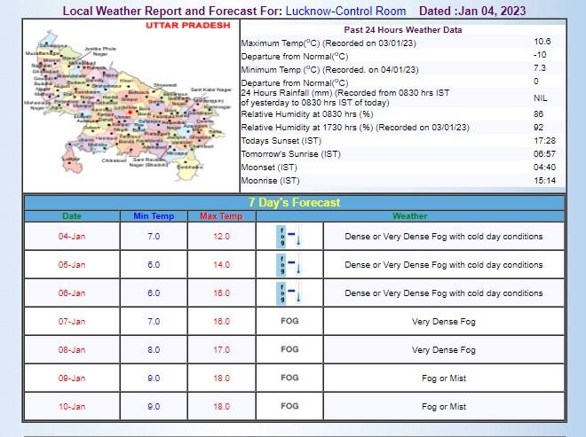 उत्तर प्रदेश की राजधानी लखनऊ में आज न्यूनतम तापमान 7 डिग्री और अधिकतम तापमान 12 डिग्री दर्ज किया जा सकता है. वहीं, लखनऊ में आज भी घना कोहरा और कोल्ड डे की स्थिति देखने को मिल रही है. मौसम विभाग ने सात जनवरी तक राज्य के 27 जिलों में घने कोहरे और कोल्ड डे के लिए रेड अलर्ट जारी किया है. वहीं, 31 जिलों में बेहद खराब मौसम की चेतावनी भी जारी की गई है.
