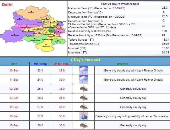मौसम विभाग (IMD) की मानें तो देश की राजधानी नई दिल्ली में आज यानी 11 सितंबर को न्यूनतम तापमान 24 डिग्री और अधिकतम तापमान 32 डिग्री दर्ज किया जा सकता है.वहीं, आज नई दिल्ली में बादलों का डेरा रहेगा. इस दौरान राजधानी में बारिश भी दिख सकती है. दिल्ली में हल्की बारिश और बूंदाबांदी की भी संभावना है. हालांकि, उमस से राहत मिली रहेगी.