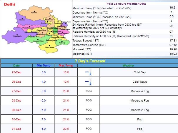 मौसम विभाग (IMD) के मुताबिक, दिल्ली में (रविवार), 26 दिसंबर को न्यूनतम तापमान 4 डिग्री सेल्सियस और अधिकतम तापमान 19 डिग्री सेल्सियस तक बना रहने का अनुमान है. शीतलहर की चेतावनी भी है. राज्य में अगले कुछ दिन कोहरे का सितम देखने को मिलेगी.