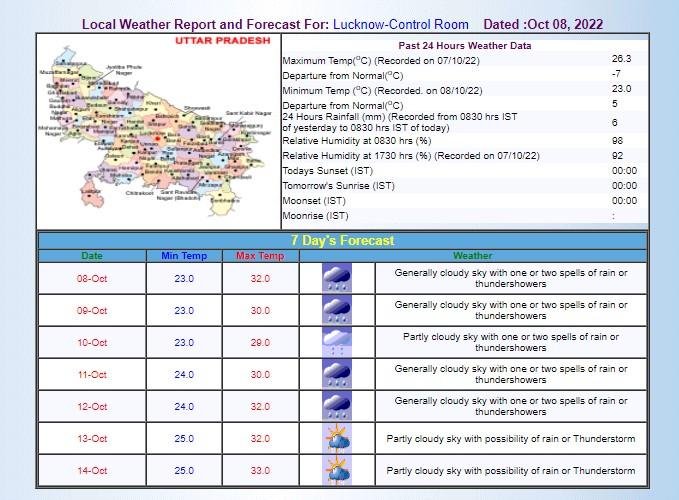 IMD के मुताबिक, उत्तर प्रदेश में भी दो दिन से हो रही बारिश अभी कुछ दिनों तक जारी रह सकती है. 9 अक्टूबर की बात करें तो आंधी-बारिश के जारी रहने के संकेत हैं. वहीं, न्यूनतम तापमान 23 डिग्री सेल्सियस तो अधिकतम तापमान 30 डिग्री सेल्सियस रह सकता है. अक्टूबर में बरसते बादलों के पीछे दो बड़े कारण बताये जा रहे हैं, एक तो बंगाल की खाड़ी में कम दबाव पैदा हुआ है, दूसरे मॉनसून की वापसी में देर हुई है.