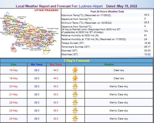 मौसम विभाग के अनुसार, जम्मू में आज का न्यूनतम तापमान 26 डिग्री सेल्सियस रहेगा, जबकि अधिकतम तापमान 43 डिग्री सेल्सियस रह सकता है. यूपी की राजधानी लखनऊ का न्यूनतम तापमान 29 डिग्री तो अधिकतम तापमान 44 डिग्री सेल्सियस तक रहने के आसार हैं.