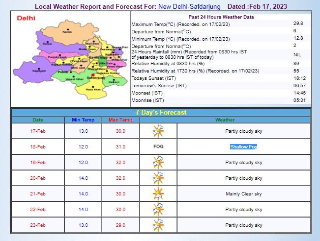 देश की राजधानी दिल्ली में आज यानी 18 फरवरी को न्यूनतम तापमान 13 और अधिकतम तापमान 30 डिग्री दर्ज किया जा सकता है. वहीं, हल्का कोहरा भी दिल्ली में रह सकता है. मौसम पूर्वानुमान एजेंसी स्काईमेट की मानें तो इस बार फरवरी में एक भी दिन बारिश नहीं हुई है, लेकिन 19 और 20 फरवरी को दिल्ली में बादल छाए रह सकते हैं.