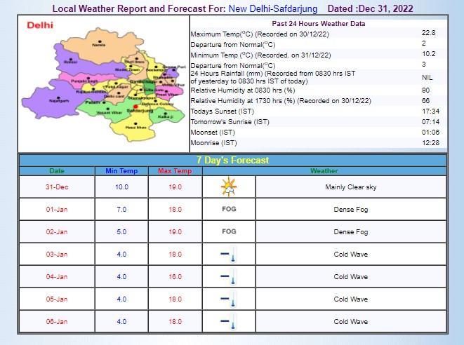खास दिल्ली के मौसम की बात का जाए तो पिछले दो दिन यहां का औसत तापमान 3 से 6 डिग्री बढ़ गया था. हालांकि न्यू ईयर यानि 1 जनवरी से ठंड का दौर फिर लौटने वाला है. आज न्यूनतम तापमान 7 डिग्री सेल्सियस और अधिकतम तापमान 18 डिग्री सेल्सियस रहने के आसार हैं. वहीं प्रदूषण की बात की करें तो दिल्ली में आज भी हवा का स्तर खतरनाक बना हुआ है.