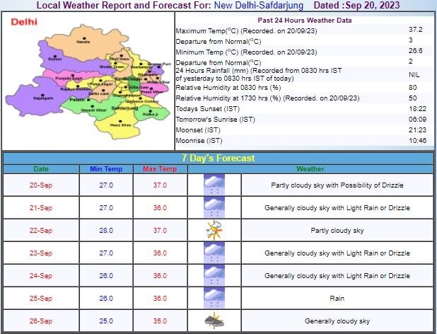 मौसम विभाग की मानें तो देश की राजधानी नई दिल्ली में आज यानी 21 सितंबर को न्यूनतम तापमान 27 डिग्री और अधिकतम तापमान 36 डिग्री दर्ज किया जा सकता है. इसी के साथ, नई दिल्ली के इलाकों में हल्की बारिश या बूंदाबांदी की गतिविधियां देखने को मिलेंगी. 22 सितंबर को नई दिल्ली में बादलों का डेरा रहेगा, लेकिन बारिश का पूर्वानुमान नहीं है.