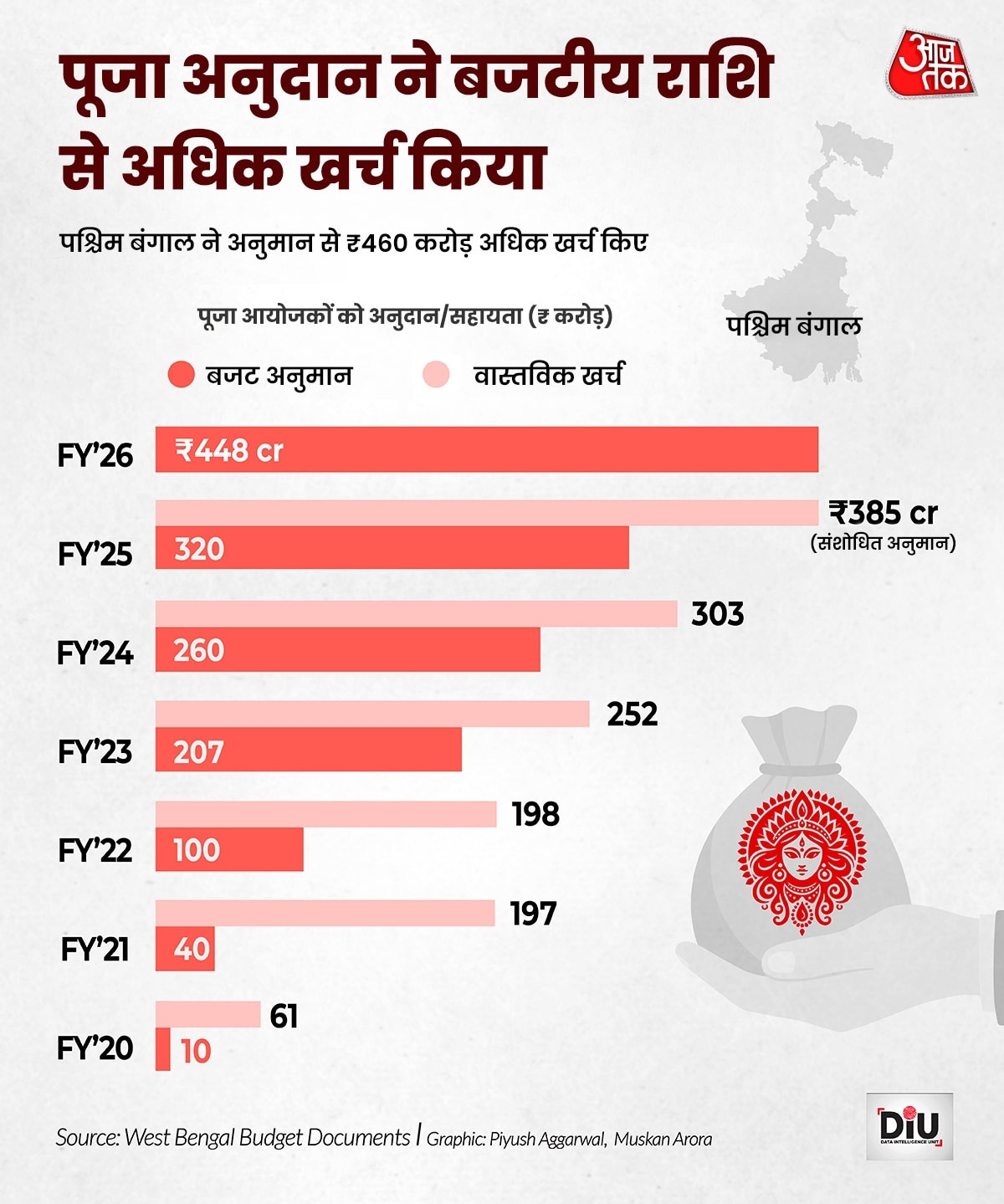 बता दें कि ये कोई इसी बार लिया गया पहला फैसला नहीं है. राज्य के बजट दस्तावेज बताते हैं कि पिछले छह सालों में दुर्गा पूजा पर सरकारी खर्च कई गुना बढ़ा है. साल 2019-20 से लेकर 2025-26 तक पूजा आयोजकों को दिए जाने वाले बजटेड ग्रांट्स लगभग 45 गुना बढ़ गए हैं. इसमें दिलचस्प बात ये है कि असल खर्च अक्सर बजट अनुमान से कहीं ज्यादा रहा है.