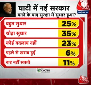 इस सवाल का जवाब देते हुए 41 प्रतिशत लोगों का मानना है कि सरकार आतंकवाद पर 'काफी हद तक' रोक लगाने में सफल रही है. जबकि 27 प्रतिशत लोगों का मानना है कि सरकार कुछ हद तक आतंकवाद पर रोक लगाने में सफल रही है. वहीं, 28 प्रतिशत का मानना है कि सरकार असफल रही है.