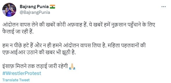 बजरंग पूनिया ने सोमवार को ट्वीट कर कहा था कि आंदोलन वापस लेने की खबरें कोरी अफवाह हैं. ये खबरें हमें नुकसान पहुंचाने के लिए फैलाई जा रही हैं. हम न पीछे हटे हैं और न ही हमने आंदोलन वापस लिया है. महिला पहलवानों की एफआईआर उठाने की खबर भी झूठी है. इंसाफ मिलने तक लड़ाई जारी रहेगी.