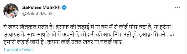 वहीं, साक्षी मलिक ने ट्वीट कर कहा था कि आंदोलन से पीछे हटने की खबर बिलकुल गलत है. इंसाफ की लड़ाई में ना हम में से कोई पीछे हटा है, ना हटेगा. सत्याग्रह के साथ साथ रेलवे में अपनी जिम्मेदारी को साथ निभा रही हूं. इंसाफ मिलने तक हमारी लड़ाई जारी है. कृपया कोई गलत खबर ना चलाई जाए.