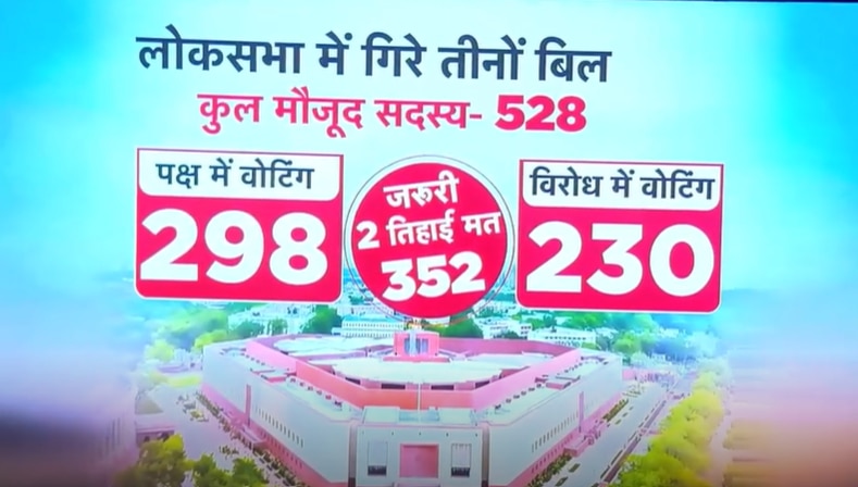 सरकार बड़े ही शोर-शराबे के साथ महिला आरक्षण से जुड़े तीन बिल लेकर आई थी. यह बिल लोकसभा में गिर गए हैं. 131वां संविधान संशोधन बिल पारित कराने के लिए लोकसभा में दो तिहाई बहुमत की जरूरत थी, लेकिन यह बिल जरूरी आंकड़े से 54 वोट पीछे रह गया. इस बिल पर कुल 528 वोट पड़े. वोटिंग के आंकड़ों के हिसाब से यह संविधान संशोधन बिल पारित कराने के लिए सरकार को 352 वोट की जरूरत थी, लेकिन इसके पक्ष में 298 वोट ही पड़े.
