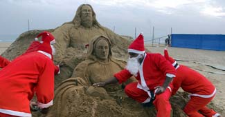 क्रिसमस के मौके पर इलाहाबाद में सेंटा क्लाज का मुखौटा लगाकर गंगा की आरती करते हिन्दू पुजारी.