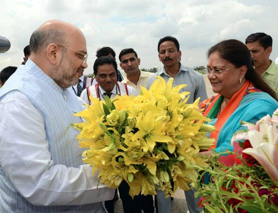 सांगानेर अंतरराष्ट्रीय हवाई अड्डे पर अमित शाह के स्वागत के लिए मुख्यमंत्री वसुंधरा राजे के अलावा भाजपा प्रदेश अध्यक्ष अशोक परनामी, राजे मंत्रिमंडल के सदस्यों और हजारों पार्टी कार्यकर्ता मौजूद थे.