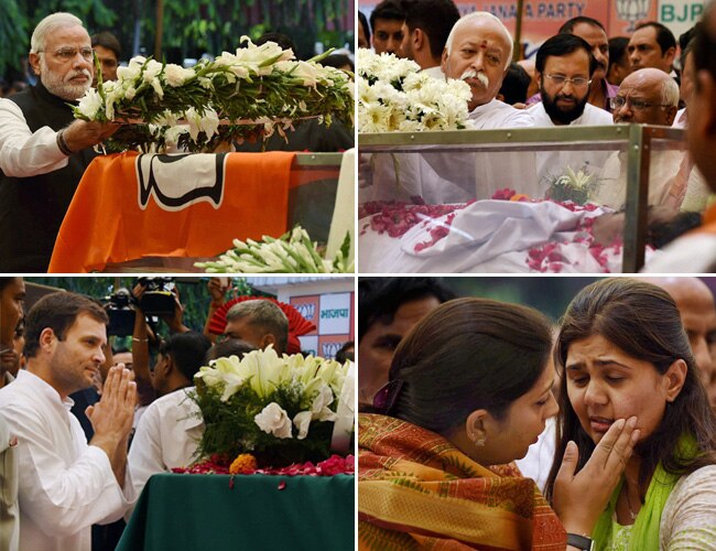 संघ प्रमुख मोहन भागवत भी गोपीनाथ मुंडे को श्रद्धांजलि देने बीजेपी दफ्तर पहुंचे. साथ में बीजेपी नेता और मुंडे का पार्थिव शव.