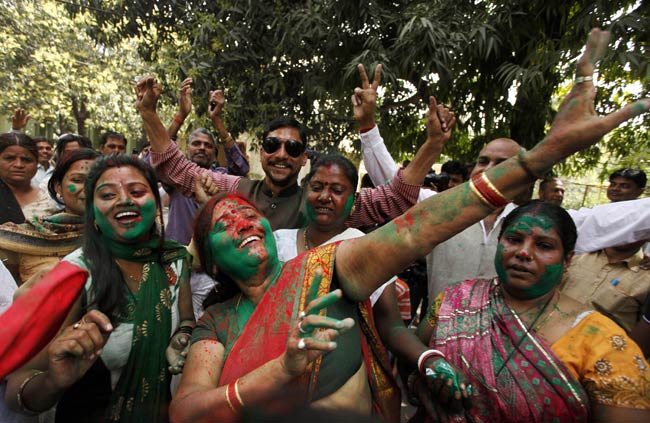 यूपी चुनावों में जैसे-जैसे मतों की गिनती होती गई, समाजवादी पार्टी की जीत की तस्वीर साफ होने लगी. पार्टी कार्यकर्ता जीत की खुशी में होली से दो दिन पहले ही होली मनाने लगे.