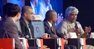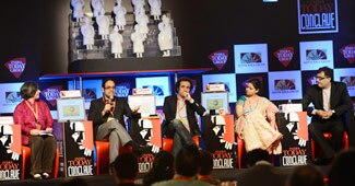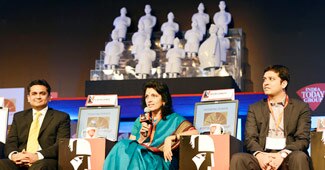 चेतन भगत इंडिया टुडे मैगजीन की एडिटर इन चीफ कावेरी बामजाई और हेडलाइंस टुडे की एंडर पद्मजा जोशी के साथ.