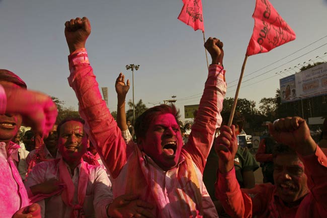 तेलंगाना समर्थकों ने लोकसभा में बिल पास होते ही इस तरह खुशी में होली खेली.