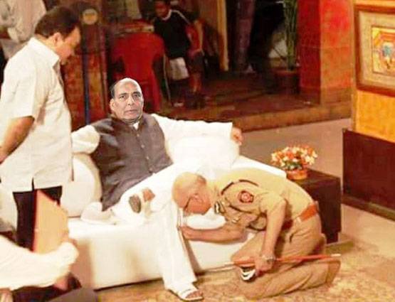 (पहली तस्वीर- राजनाथ के चरणों में गुजरात के DGP) राजनाथ से जु़ड़ी ये तस्वीर पूरी तरह से फर्जी निकली. पहला सच तो यह कि गुजरात पुलिस के डीजीपी कोई पुरुष नहीं बल्कि एक महिला है जिनका नाम गीता जौहरी है. दूसरा सच इस तस्वीर का सामने आया जिसमें पता चला कि ये तस्वीर एक फिल्म की जिसका नाम 'क्या यही सच है'. इस फोटो में जिनको राजनाथ सिंह बोला है वो एक नेता का किरदार निभा रहे हैं और जिनको डीजीपी बोला है वो एक पुलिस का किरदार निभा रहे हैं. यह फिल्म पूर्व आईपीएस ऑफिसर योगेश प्रदाप सिंह के निर्देशन में 2011 में पुलिस और नेताओं के रिश्ते पर बनी 'क्या यही सच है' टाइटल वाली फिल्म से इस तस्वीर को लिया गया और फोटोशॉप का इस्तेमाल करके उसमें राजनाथ सिंह की तस्वीर लगा दी गई.