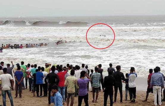 डूबते मछुआरे समुद्र की ओर आगे बढ़ने लगे तो तट पर खड़े लोगों ने मानव श्रृंखला बनाकर उनकी जान बचाई.